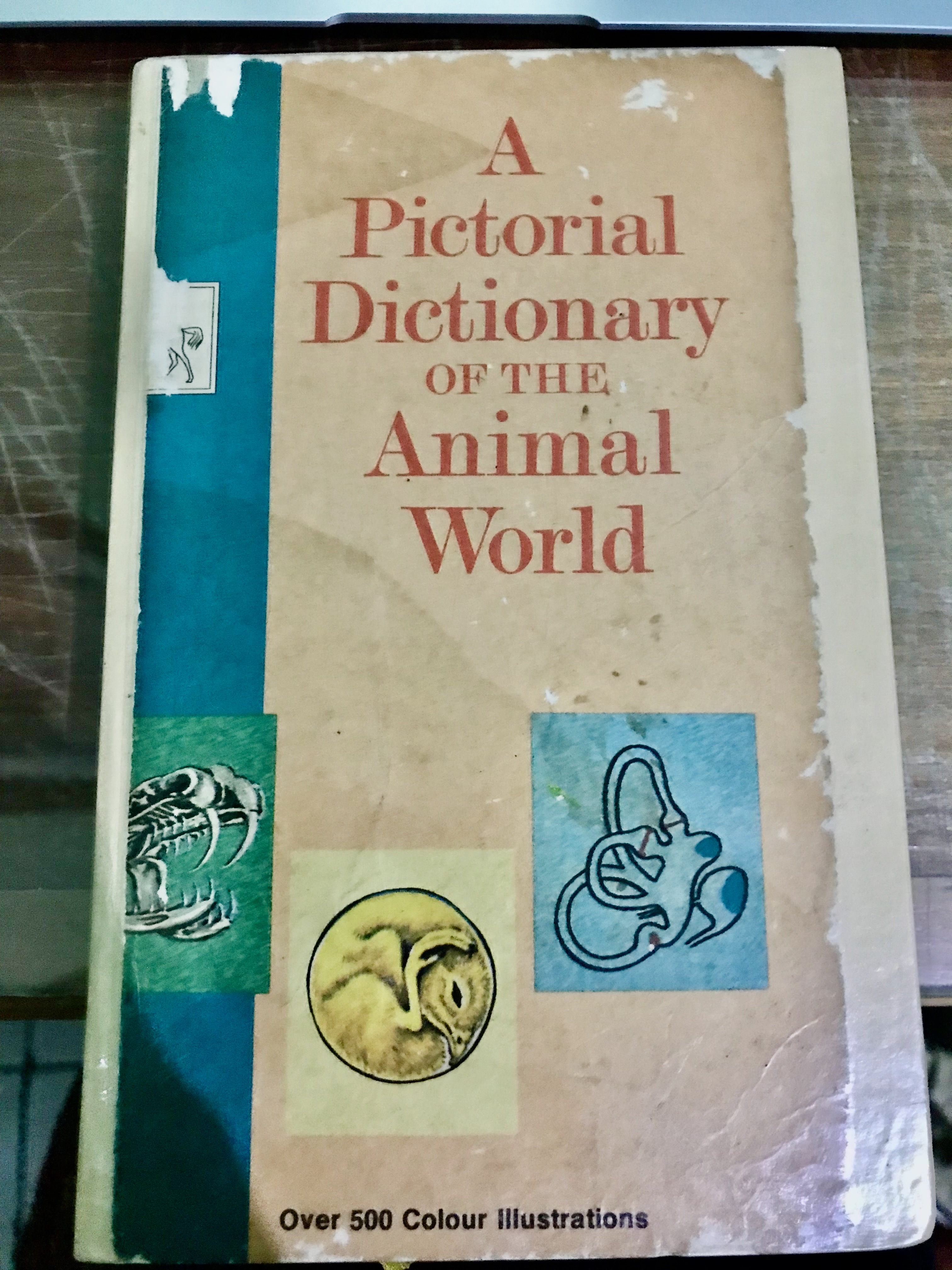 Yesterday, I found A Pictorial Dictionary of the Animal World, published in 1966. It starts with abdomen and ends with zygote and has many biology terms and pictures in between. I never saw this book before until I was browsing my dad’s bookshelf yesterday. I think it was my dad’s when he was studying English.