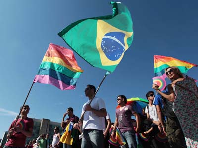 Come out: People wave gay movement flags (left and right) and the Brazilian flag during a march against homophobia in Brasilia, Brazil, on May 18. AP/Eraldo Peres